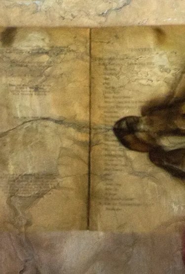 The moving image of hands leafing through a burned book was made in response to imagining picking up and trying to ‘read’ one of the burned and fragilised books, that would have been found in the streets after the bombings in Al-Mutanabbi Street*, which is the cultural quarter of booksellers and cafes in Baghdad. Transporting this through projection onto the wall of a cave in the Brecon Beacon mountains, Plato’s ‘The Allegory of the Cave’ comes to mind, and the idea of shadows of images, as well as the elusive nature of knowledge. The burned fragmented pages of printed text blend into the near archaeological primordial of scratches and incisions that cover the walls, and which are invisible to the naked eye in the depths of this seemingly timeless underworld.